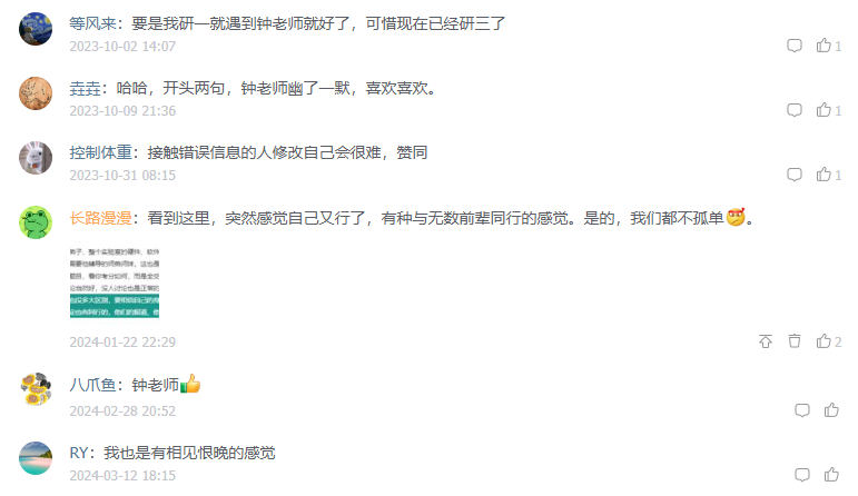 钟老师,您好,我是一个默默关注您的小粉丝,从B站到QQ群到飞书再到现在的知识星球,我也从双非硕士到了某985博士(现马上博二)。首先,我想先表达一下跟着您学习的感悟,最大的收获就是您的科研方法,对于一个新的方向能够全面快速的了解,这一个过程能够很大的提高一个内心自卑的学生的自信,我也因此了解到了更多的研究方向和可行性。其次,我最后悔的也是没有早点认识您,从一封一封的申博信到最后被录取,但整个过程存在一个很大的误区,“从始至终作为一个学生身份,考虑申博和读博的过程”,而自己天真的以为也应该是这样的,进入实验室后发现大相径庭,老板只喜欢能给ta带来钱的学生,再后来看到您分享的视频对其中的内容深有体会。最后,作为一个渴望博士毕业的博士生,想向您提问一些我最近遇到的困惑。
